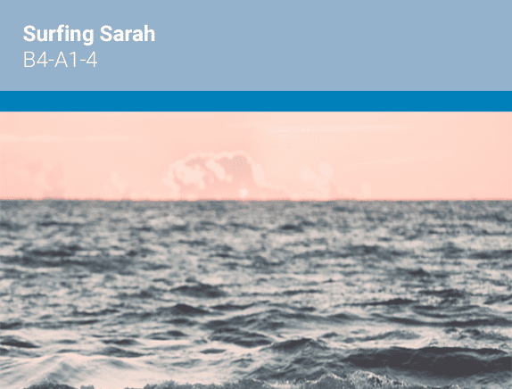 Even in neutral spaces, the colours of the City to Surf palette work well. This colour story features the kind of calm cooling hues that serve as ideal complements, offering just the right amount of colour. The muted blue of Surfing Sarah (B4-A1-4) is reminiscent of a gorgeous cloudless sky and fits well as a tasteful accent to an understated space.