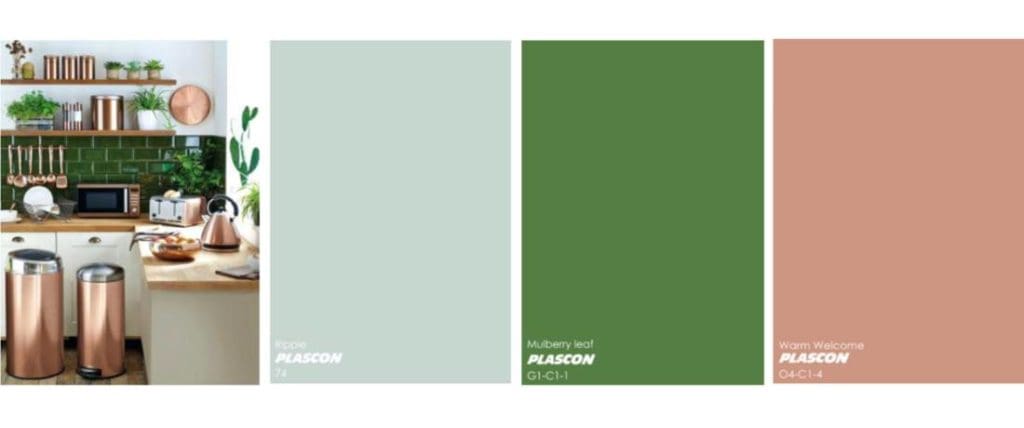 Rose gold has been trending for some time now and this will continue for a few more seasons, using Mulberry Leaf can balance a glamorous space making it a more accessible space to live. With a soft cool grey (Ripple 74) as a background colour and balancing the earthy green (Mulberry Leaf) along with the cool and copper-like pink (Warm Welcome O4-C1-4).