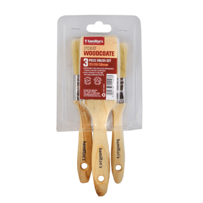 Woodcoate 3-brush Set is a natural, blonde bristle-blend brush set designed for applying varnishes, stains, wood coatings and decorative paints.