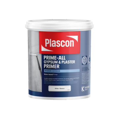 Plascon Prime-All Gypsum & Plaster Primer (UC 10) is a water-based primer for masonry and gypsum surfaces.