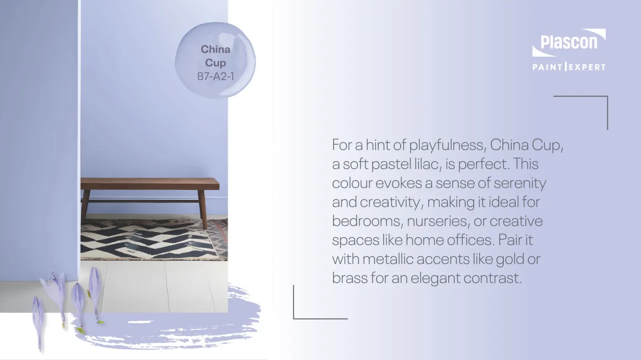 Tranquil Elegance For a hint of playfulness, China Cup, a soft pastel lilac, is perfect. This colour evokes a sense of serenity and creativity, making it ideal for bedrooms, nurseries, or creative spaces like home offices. Pair it with metallic accents like gold or brass for an elegant contrast.