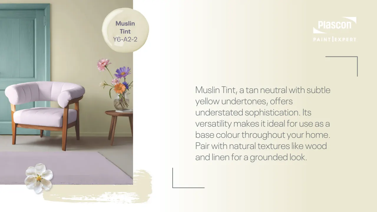 Neutral Sophistication Muslin Tint, a tan neutral with subtle yellow undertones, offers understated sophistication. Its versatility makes it ideal for use as a base colour throughout your home, perfect for living spaces and kitchens that need a soft, earthy touch. Pair it with natural textures like wood and linen for a grounded look.