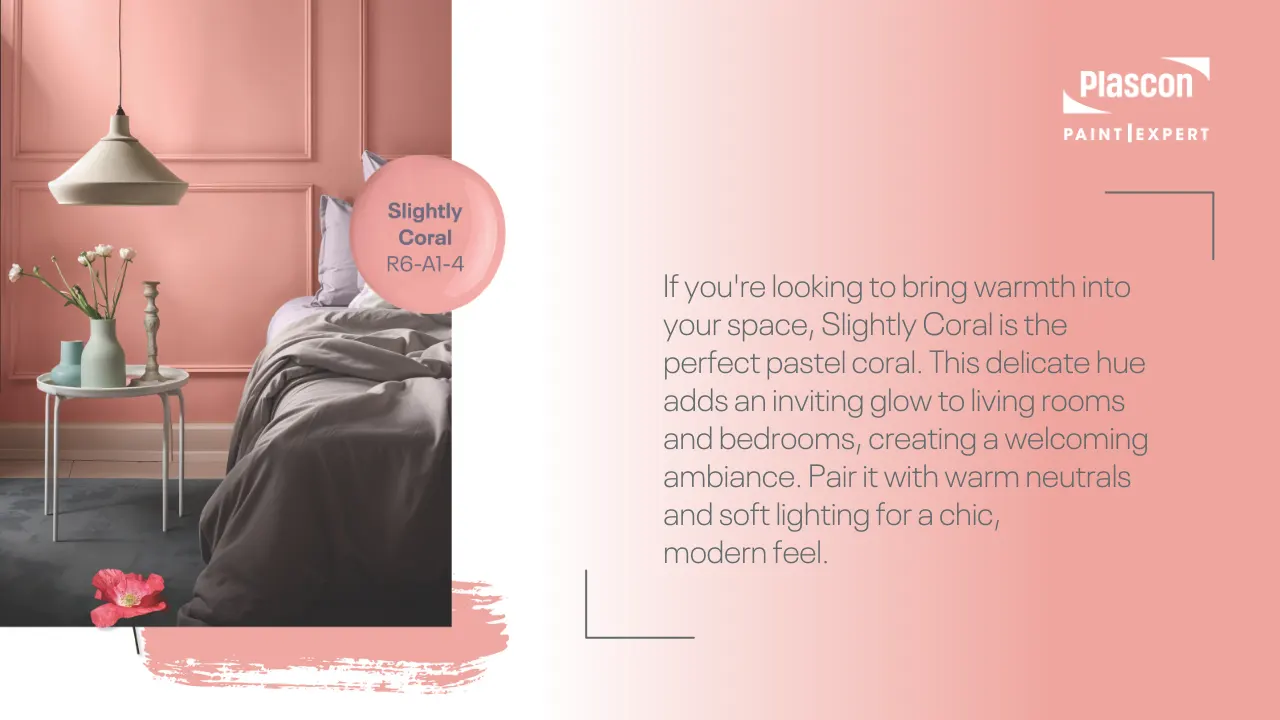 Warmth and Comfort If you’re looking to bring warmth into your space, Slightly Coral is the perfect pastel coral. This delicate hue adds an inviting glow to living rooms and bedrooms, creating a welcoming ambiance. Pair it with warm neutrals and soft lighting for a chic, modern feel.