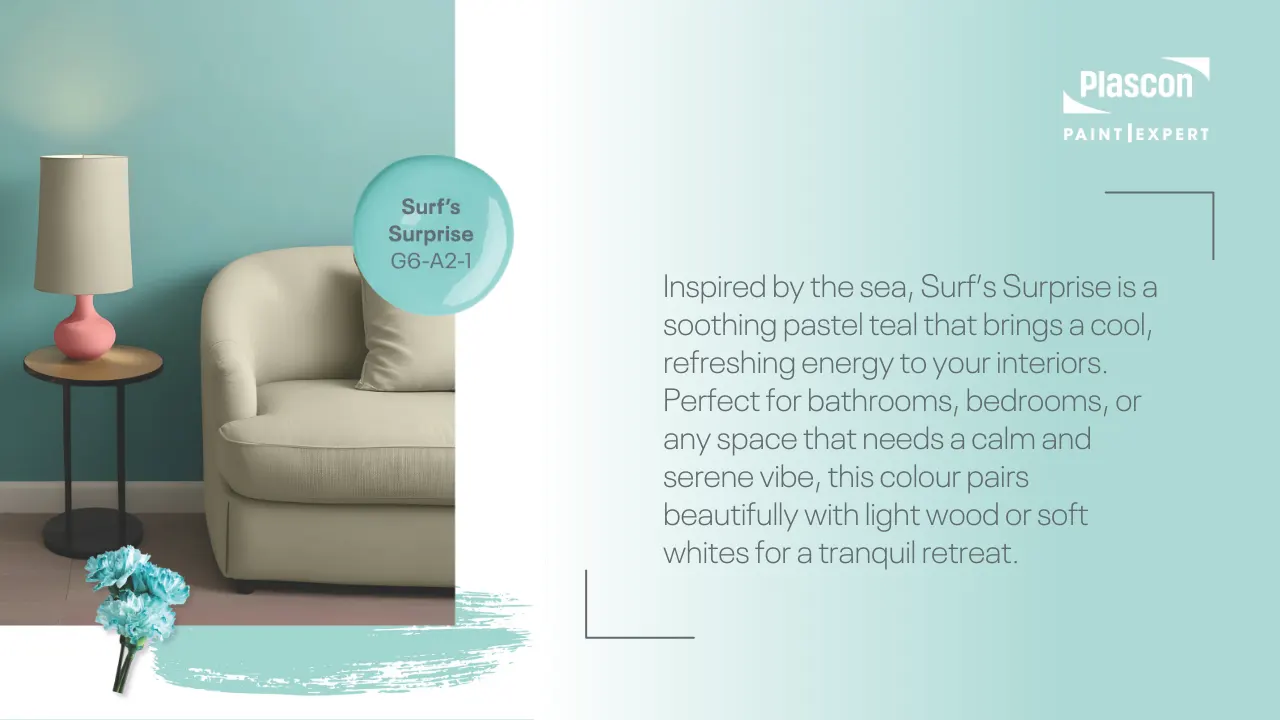 Refreshing Coolness Inspired by the sea, Surf’s Surprise is a soothing pastel teal that brings a cool, refreshing energy to your interiors. Perfect for bathrooms, bedrooms, or any space that needs a calm and serene vibe, this colour pairs beautifully with light wood or soft whites for a tranquil retreat.