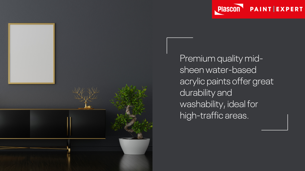 A very popular class of water-based acrylic paints are the mid-sheen coatings. Premium quality paints in this category offer great durability and washability. Two top examples are Plascon Double Velvet Pure, and Plascon Easy Living Multi-purpose Sheen.
