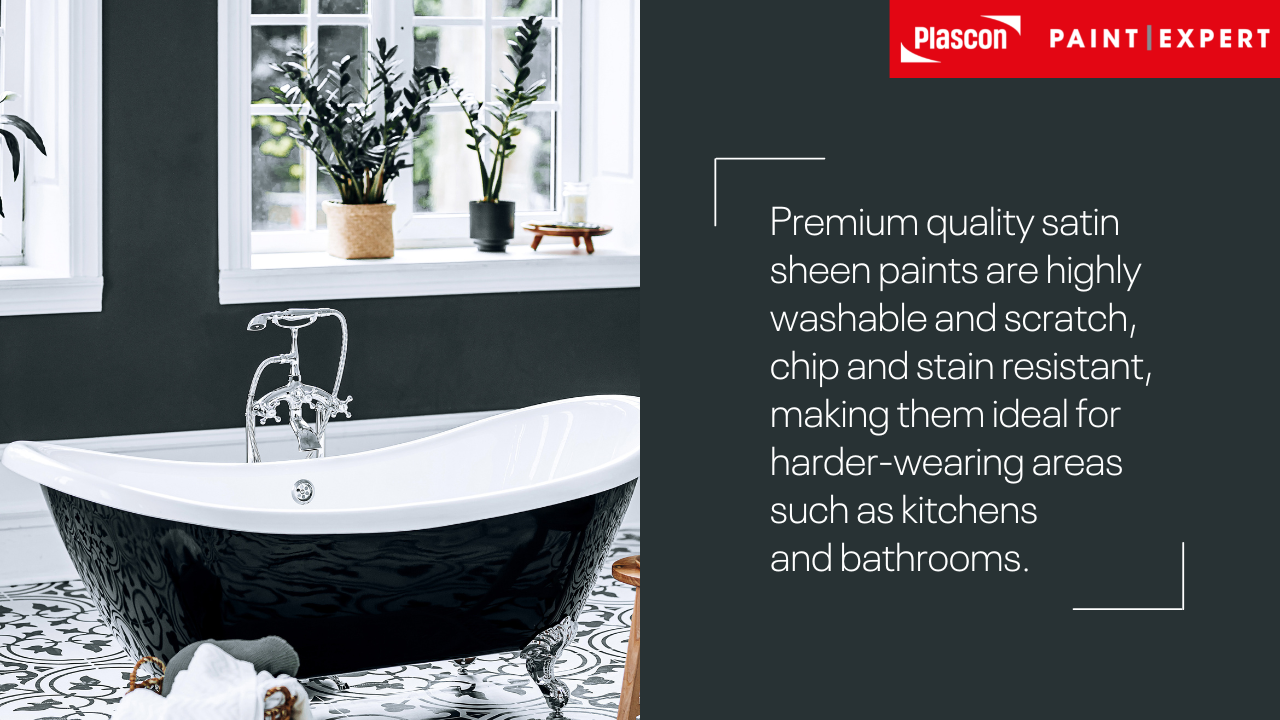 Satin sheen paints are ideal for harder-wearing areas that require a slight sheen, such as kitchens and bathrooms. Premium quality satin sheen paints are highly washable and scratch, chip, and stain resistant.  Plascon Velvaglo is probably the most well-known satin sheen paint in South Africa. Some of its features and benefits: