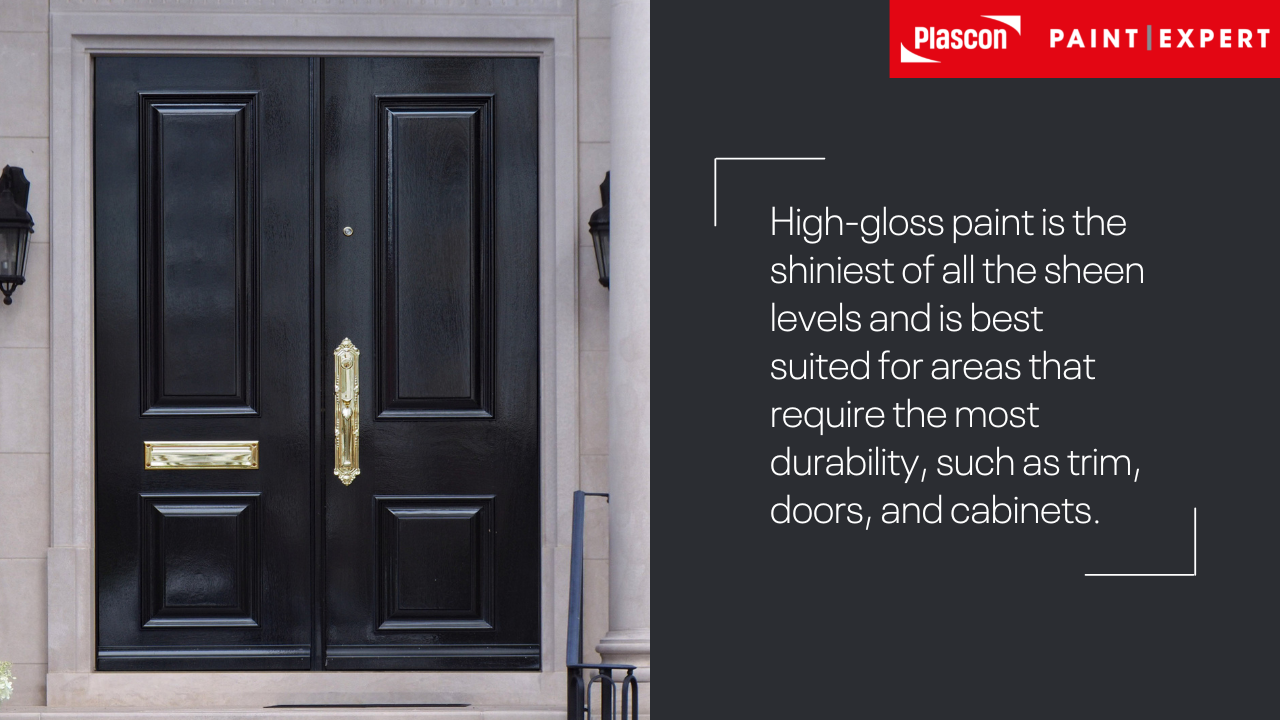 High-gloss paint is the shiniest of all the sheen levels and is best suited for areas that require the most durability, such as trim, doors, and cabinets. Its high-sheen finish makes it easy to clean and can help reflect light, creating a bright and open feel in a room. However, its glossy finish can also emphasize imperfections on walls, so it’s important to make sure the walls are smooth and well-prepared before applying this type of paint.