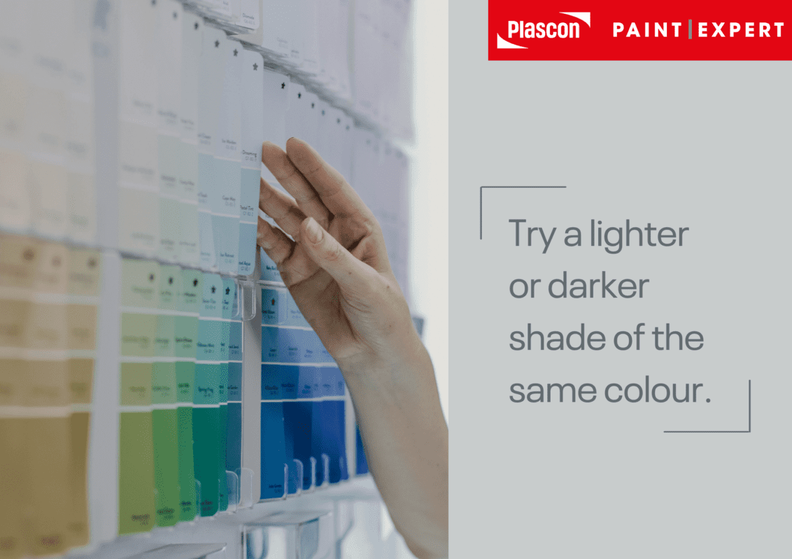 Sometimes, all it takes to find the right interior paint colour is a little tweaking. Think about a lighter or darker shade of the same colour before giving up on the colour you chose. Our Plascon paint swatches show a colour in a range of shades, making it easy for you to get your chosen colour a few shades lighter or darker. You can also ask your local paint expert store to make a custom hue for you with different amounts of light and dark shades.